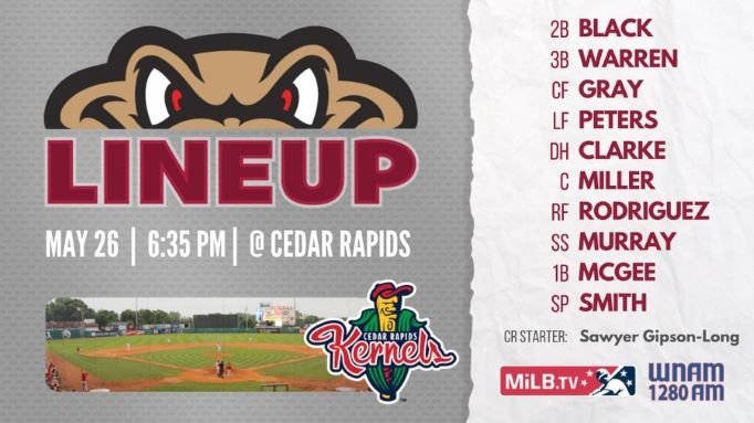 The Rattlers are even 1-1 in their series at first place Cedar Rapids, with LHP Russell Smith (5.25 ERA, 1.50 WHIP, 9.8 K/9 in 24 innings) getting the start tonight. RF Carlos D. Rodriguez has multiple hits in 4 of his last 5 games, including going 3-for-4 yesterday with a home run: