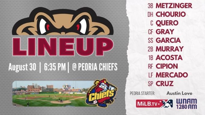 Wisconsin is in Peoria this week to battle the Cardinals' High-A affiliate. RHP Stiven Cruz aims for a 3rd straight impressive start (12 IP, 1 ER, 2 H, 3 BB, 1 HBP, 12 Ks in first 2 games). Will DH/OF Jackson Chourio (.844 High-A OPS) play all 9 innings tonight? First base will likely be an interesting rotation, with INF Jose Acosta (.670 High-A OPS) getting a crack at it tonight: