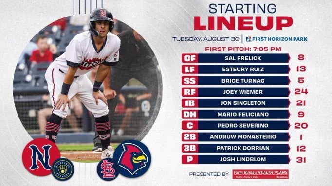 First place Nashville hosts Cardinals' AAA affiliate Memphis this week and has RHP Josh Lindblom (2.12 ERA with 23 Ks in last 17 innings) looking for his 4th straight victory tonight. SS Brice Turang has hit safely in 11 of his last 12 games: