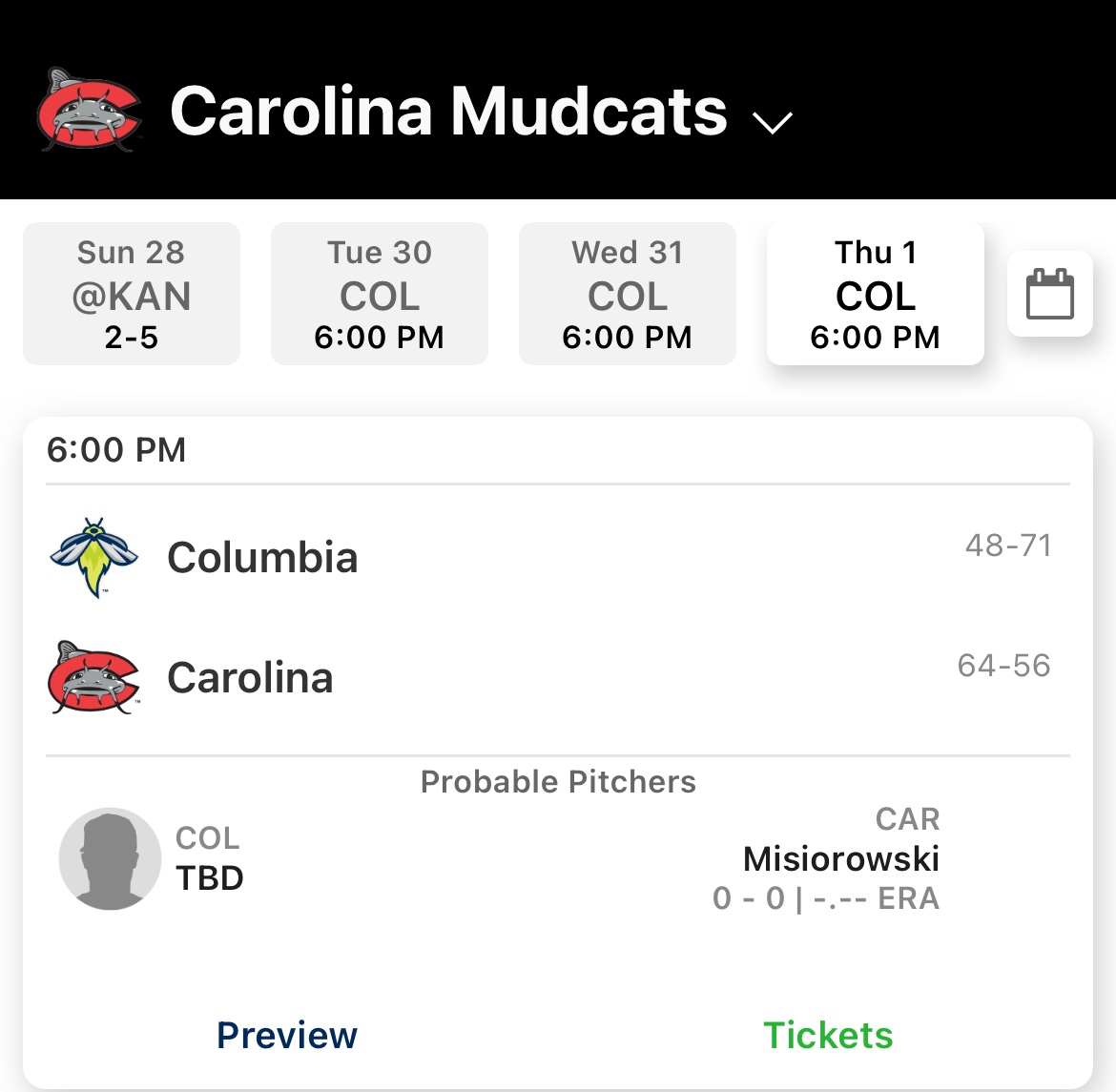 Carolina hosts Royals' Low-A affiliate Columbia this week and welcomes 2022 first round pick DH/SS Eric Brown Jr. (.839 OPS in 56 Mudcat plate appearances) back to the lineup after a one-week absence. RHP Logan Henderson (4 IP, 1 R, 4 H, 0 BB, 7 Ks in first 2 outings) is starting the opener: