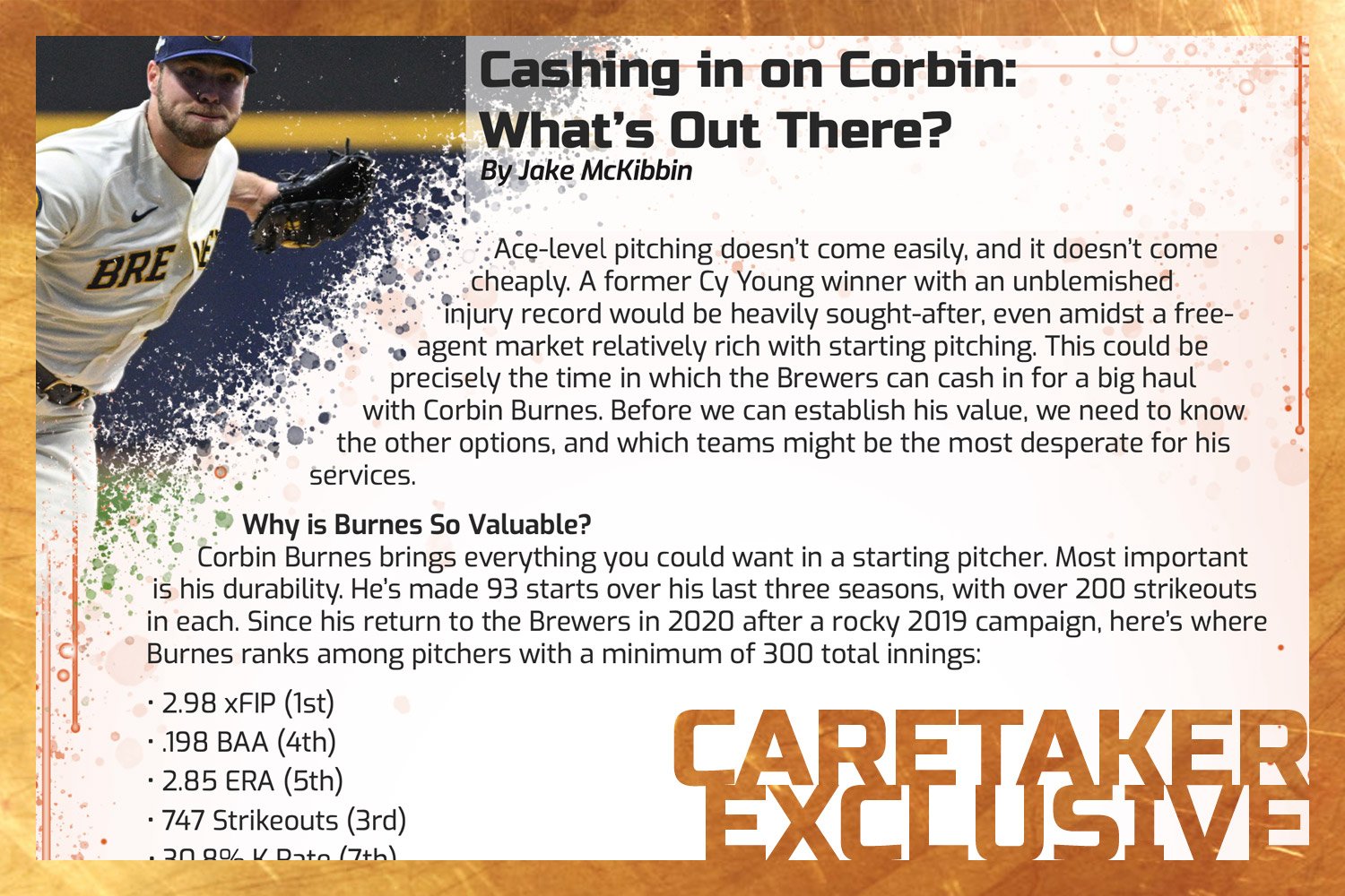 Corbin Burnes brings everything you could want in a starting pitcher. Most important is his durability. He’s made 93 starts over his last three seasons, with over 200 strikeouts in each. Since his return to the Brewers in 2020 after a rocky 2019 campaign, here’s where Burnes ranks among pitchers with a minimum of 300 total innings:
