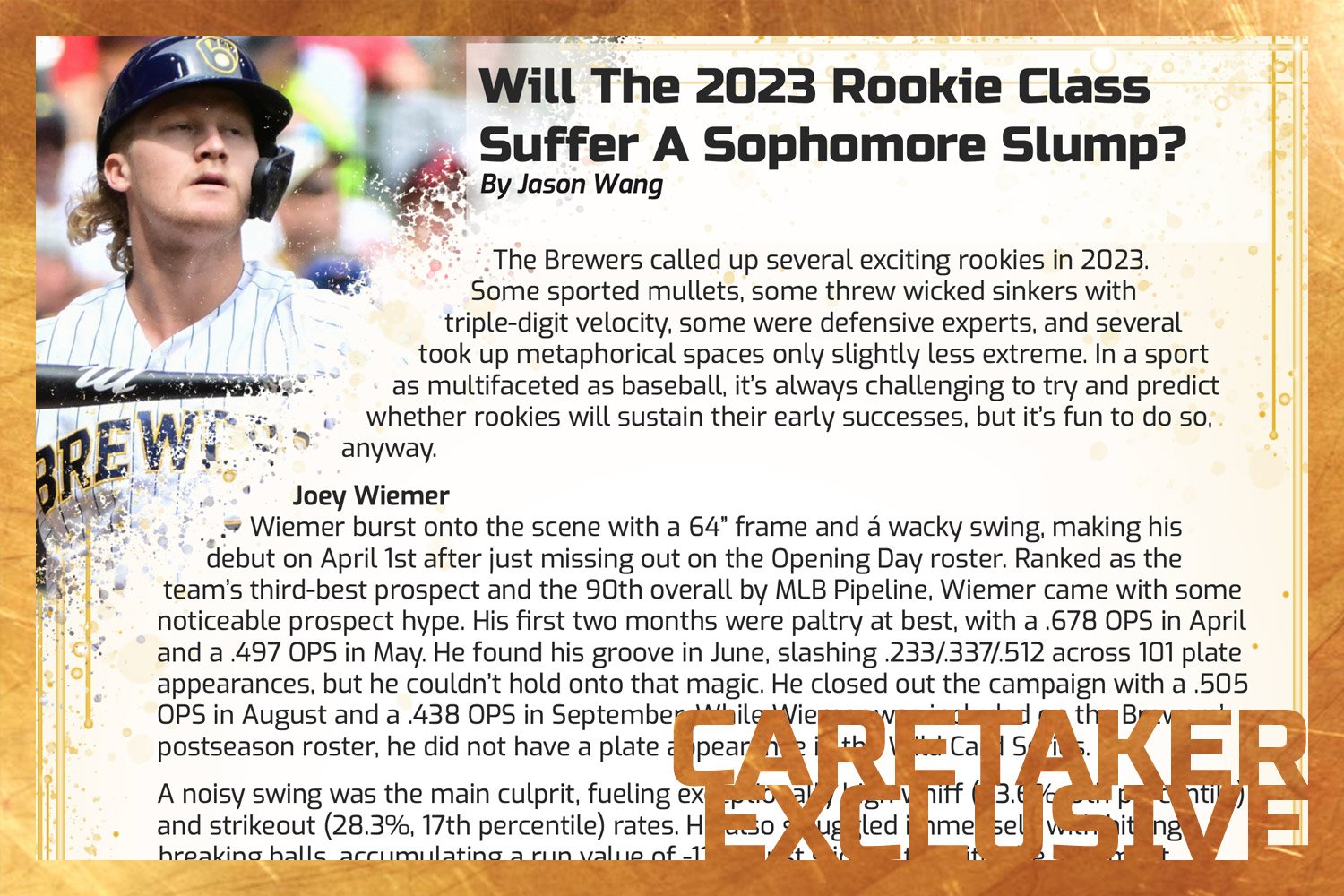 Wiemer burst onto the scene with a 64” frame and á wacky swing, making his debut on April 1st after just missing out on the Opening Day roster. Ranked as the team’s third-best prospect and the 90th overall by MLB Pipeline, Wiemer came with some noticeable prospect hype. His first two months were paltry at best, with a .678 OPS in April and a .497 OPS in May. He found his groove in June, slashing .233/.337/.512 across 101 plate appearances, but he couldn’t hold onto that magic. He closed out the campaign with a .505 OPS in August and a .438 OPS in September. While Wiemer was included on the Brewers’ postseason roster, he did not have a plate appearance in the Wild Card Series.