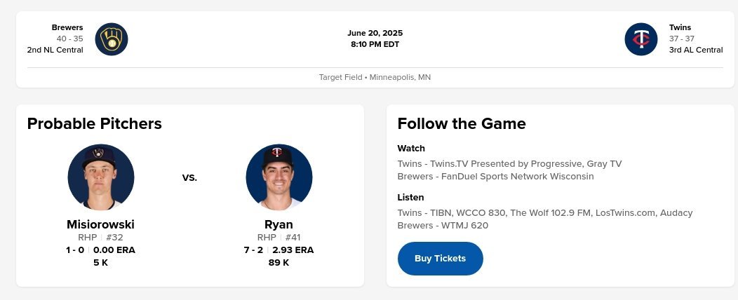 It hasn't turned out to be anywhere near that simple. With the fastball routinely showing velocity numbers that would impress even most elite one-inning relievers and maintaining a shape usually reserved for pitchers who throw about 96 instead, being ready for the fastball isn't nearly enough. Nor have the Twins looked able to make heads or tails of Misiorowski's mid-90s slider—although, to be fair, that phrase ("mid-90s slider") basically had to be invented just now.