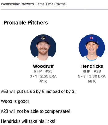 Brewers (Woodruff) vs Cubs (Hendricks): 8/30/21, 1:20pm
