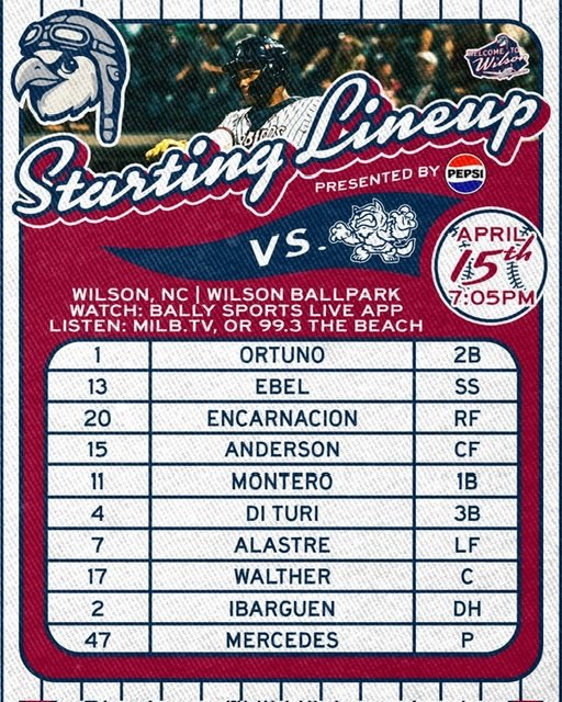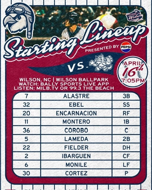 19-year old RHP Enniel Cortez (5.2 IP, 3 R, 4 Ks) makes his 3rd appearance of 2026, looking to lead Low-A Wilson to a 2-1 home series lead over Hill City. C Luis Corobo, 2B Luis Lameda and LF Nick Monile are back in action after 5-6 days resting. -
