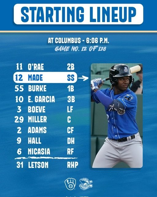 Image courtesy of BrewerFanatic Transactions: RHP Junior Fernandez acquired from Arizona and placed on Nashville’s Development List LHP Thomas Pannone activated from AAA Nashville’s 7-day injured list OF Jordyn Adams activated from AA Biloxi’s 7-day injured list This one isn’t a transaction, but it’s a helpful update from Maryvale on two recent draft picks and a Major Leaguer: https://x.com/Jesus_Cano88/status/2044867625357083020 @Jesus_Cano88 actually published a number of videos and notes from that Extended Spring Training game, in his final day at Baseball America. We are grateful. Game Action: Nashville Pre-Game Media Notes Suspended: Worcester 0, Nashville 0 in the 4th inning Box Score and Game Log Via the Sounds’ website, rainout details: Rain Suspends Thursday Tilt With Worcester Starting LHP Thomas Pannone’s first official game since 2024 was a success, as he tossed three innings of shutout ball (3 H, 0 BB, 1 Ks) on 39 pitches (27 strikes). Congrats to him after missing the 2025 season with a torn flexor tendon in his forearm. Back-to-back singles by DH Jeferson Quero and 1B Brock Wilken (infield variety) to start the bottom of the 2nd inning unfortunately went for naught, so the teams were scoreless before the rains suspended play. Friday’s outlook: Nashville leads the home series 2-0 and the teams are due to resume play on Friday in the top of the 4th inning. LHP Robert Gasser (9 IP, 4 R, 15 Ks through 2 starts in 2026) is then scheduled to start a fresh 7-inning game as nightcap. Biloxi Pre-Game Media Notes Final: Columbus 5, Biloxi 1 Box Score and Game Log Via the Shuckers’ website, game details and we encourage readers to review affiliate write-ups as part of their Link Report routine: Tayden Hall Hits First Double-A Home Run in 5-1 Loss to Clingstones Talented 21-year old starting RHP Bishop Letson came into the game in a rut (8 runs allowed (6 earned) in first 2 starts, totaling 2 2/3 IP), then unfortunately commenced this road game by conceding 2 walks and a 3-run homer amongst the first 4 batters he faced. However, he and the staff really bounced back from there, only allowing 5 more baserunners (3 hits, 2 walks) over the remaining 8 2/3 innings. RHPs Stiven Cruz (1 IP, 0 R, 2 Ks) and Tanner Gillis (3 IP, 2 R, 5 Ks) and LHP Mark Manfredi Sr. (1 IP, 0 R, 3 Ks) combined with Letson to record 13 strikeouts. Manfredi has now struck out 13 of 21 batters faced in 2026, allowing 1 hit and 3 walks (no runs) through 6 innings. Unfortunately, Biloxi’s batters only produced 4 hits, led by DH Tayden Hall’s solo shot. At least 2B Dylan O’Rae continued his red-hot start to the 2026 season with a 1-for-3 effort with a double and a walk. O’Rae has reached base safely in 11 straight games and hit safely in 10 of them. Shuckers’ Extras: Let’s hope that OF/INF Mike Boeve’s 0-for-4, 4K performance is the nadir on his 2026 campaign, with a turnaround on the way. OF Jordyn Adams’ return from injury didn’t go exactly as he hoped: 0-for-4, ejected while making the final out of the game. Friday’s outlook: 24-year old RHP Tyson Hardin (6 IP, 8 R, 12 Ks through 2 starts) will toe the slab as Biloxi needs a win to even the series 2-2. Wisconsin Pre-Game Media Notes Final: Peoria 24, Wisconsin 7 Box Score and Game Log Via the Timber Rattlers’ website, game details: Wisconsin Drops Decision to Peoria Video highlights of the touchdowns and field goals accumulated in this high-scoring affair were thankfully put together by Wisconsin’s terrific media team: 19-year old RHP Ethan Dorchies was hoping for a better outing than last week (2 1/3 IP, 5 R), but he allowed 8 hits (including a 2-run homer and 3 doubles) over his 4 innings of work (6 R (4 ER), 2 BB, 3 Ks), exiting down 6-3 after 77 pitches (42 strikes). The box score details the 21 hits for Chiefs’ batters, 20 of which came against Wisconsin pitchers (and 1 off of position player Juan Baez). They also earned 12 walks. Three errors, a passed ball and balk didn’t help the Timber Rattlers’ cause, but the offense did put up 11 hits, led by SS Daniel Dickinson (3-for-5). In fact, every Wisconsin batter reached base via hit or walk in the contest, which would produce a victory most days. Timber Rattlers’ Extras: Kudos again to OF Braylon Payne for reaching base 4 times (2-for-3, 2 walks) and delivering his second homer of 2026, as well as 3B Andrew Fischer (3 RBIs) and C Blayberg Diaz (2 RBIs) for productive days at the plate. Readers will have to check the box score to review the combined 17 earned runs allowed by LHP Bjorn Johnson, RHP Yerlin Rodriguez and RHP Jose Nova over 4 innings of work. 13 Peoria batters came to the plate in their 10-run 7th inning, followed by a grand slam in the following frame. I think they’ll remember this game for a few decades to come. Friday’s outlook: RHP Bryce Meccage is scheduled to make his 3rd start of 2026 (6 2/3 IP, 3 R, 4 Ks in first 2 outings), with Wisconsin aiming to set aside Thursday’s debacle to claim a 3-1 series lead. Wilson Pre-Game Media Notes Final: Hill City 14, Wilson 1 Box Score and Game Log Via the Warbirds’ website, game details: Big Innings Lead Hill City Past Wilson 19-year old starting RHP Enniel Cortez, who was making his 3rd appearance since missing the entire 2025 season with an injury, unfortunately exited after 1 1/3 innings with an accompanying “injury delay” in the game log. We hope that there’s been no physical setback for the young hurler. In contrast to the Wisconsin game, Wilson’s pitchers only allowed 2 touchdowns on 17 hits and 7 walks in this one. Cortez (6 R (5 ER), 6 H, 2 BB, 2 Ks) and RHP Joshua Quezada (1 1/3 IP, 3 R, 4 H, 3 BB, 1 K) had the most difficult time getting outs this time around. 19-year old LHP Enderson Mercado did the heavy lifting, throwing 90 pitches over 4 2/3 innings, with all of the damage (5 runs, 2 earned) coming with 2 outs in the 5th and 7th innings. RHP Ayendy Bravo also managed to toss 2/